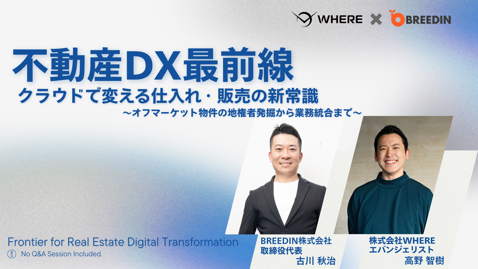 本セミナーでは、衛星データ×AIで未公開物件(オフマーケット)を発掘し、地権者特定からアプローチまで自動化する「WHERE」と、Salesforceを基盤に不動産売主業務を一元管理できる「分譲ALL ONE」を提供するブリードインが共演。