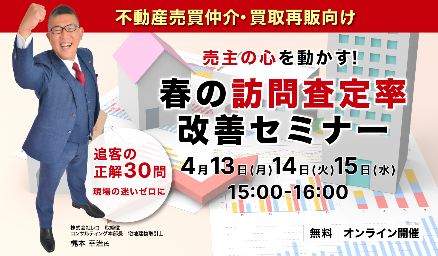本セミナーでは、不動産売買仲介が直面する「訪問査定率の改善」から「組織的な追客」、そして「選ばれるためのブランディング」まで、顧客接点の川上から川下までを網羅します。 各分野の専門家である3社の知見を結集し、分断された施策を連携させ、店舗全体の収益を最大化するための具体的な手法を解説します。