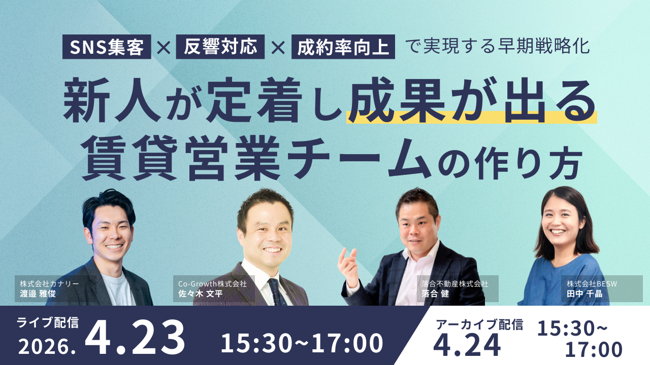 本セミナーでは、「新人が定着し、成果が出る賃貸営業チームのつくり方」をテーマに、集客・反響対応・育成の3つの観点から、現場ですぐに実践できる具体策に落とし込みながら、早期戦力化を実現するためのノウハウをお届けします。